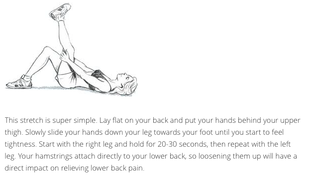 Some daily static hamstring stretches I use are the gentle knee to chest hamstring stretch and the more intense hamstring floor stretch.