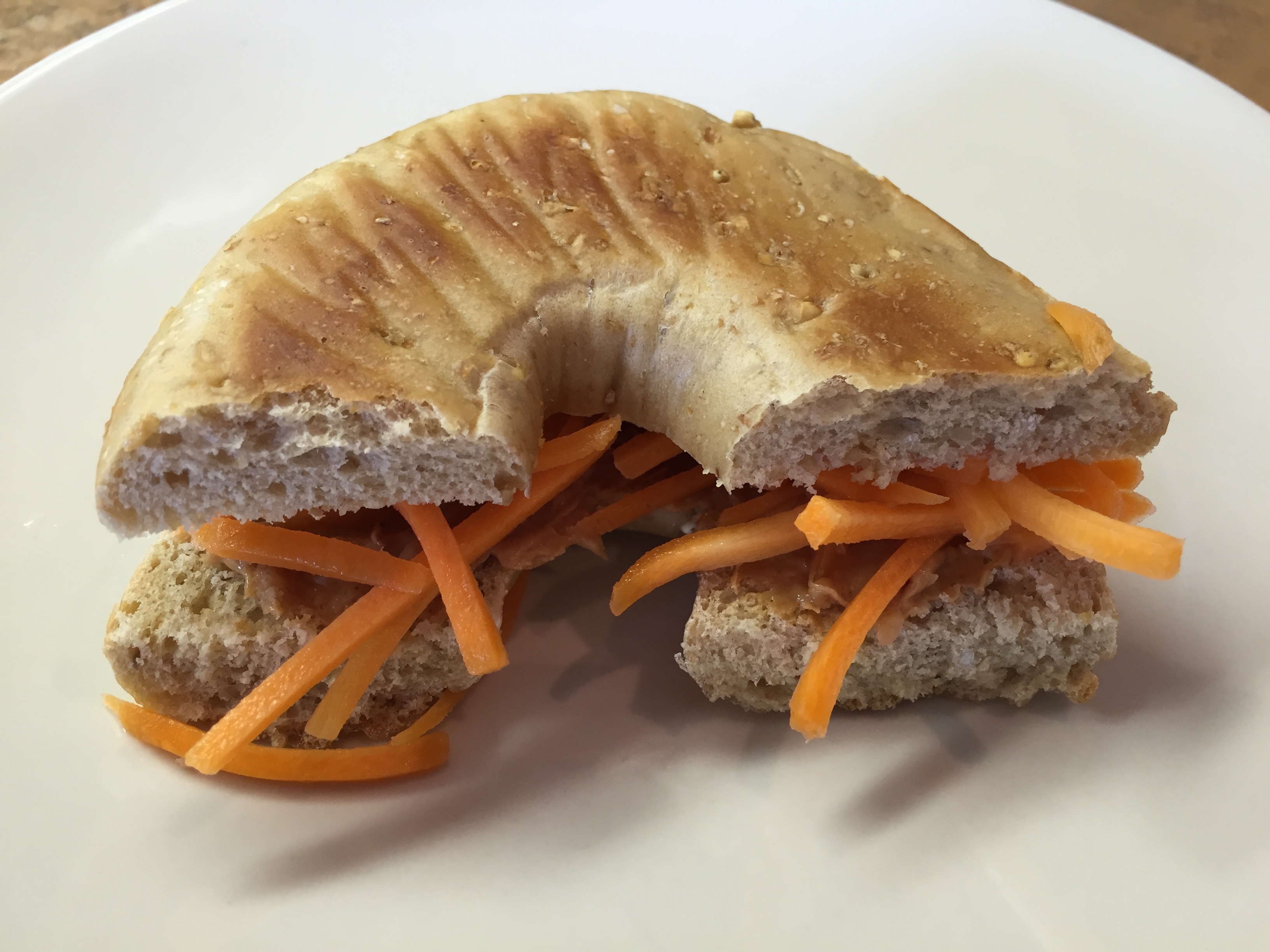 I live near a terrific wood-fired bagel shop, so sometimes I will indulge. This past Sunday I had half of a bagel topped with a little low-fat cream cheese and smoked salmon. I ate the other half the next day topped with a little peanut putter and some shredded carrot. I was able to enjoy this delicious bagel two days in a row! Eat half and save the rest for a later meal or snack.