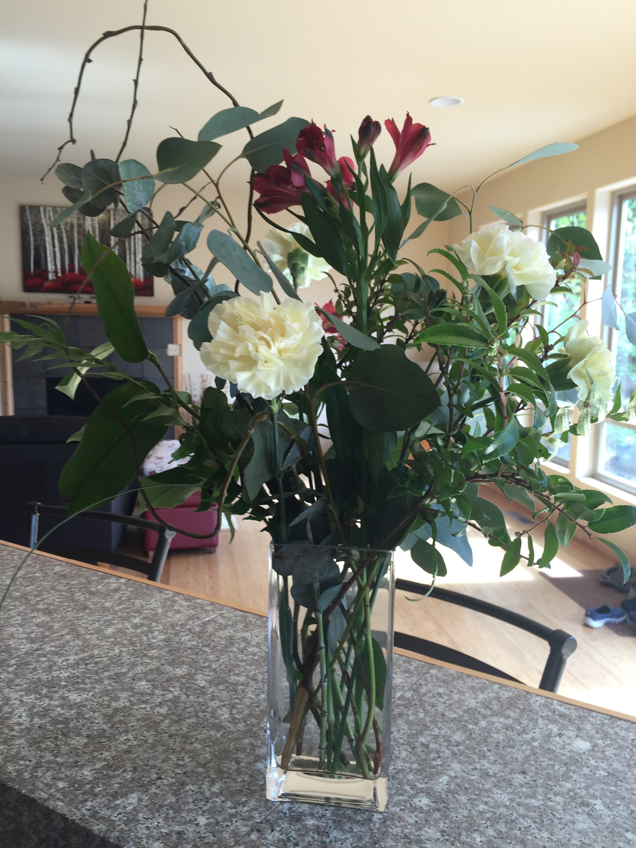 I really enjoy having flowers inside. The look and the scent make me feel like I am outside. When I pass an inside bouquet, I just have to stop, smell and gaze! I choose to get some of the less expensive, long-lasting flowers such as carnations and some greens from the grocery store and arrange a few vases to enjoy in different spots of my home. The most special flowers given to me, are those given from the heart, for no occasion except to let me know I am loved and appreciated. Try it on someone you know-I am sure you will be pleased with their reaction!