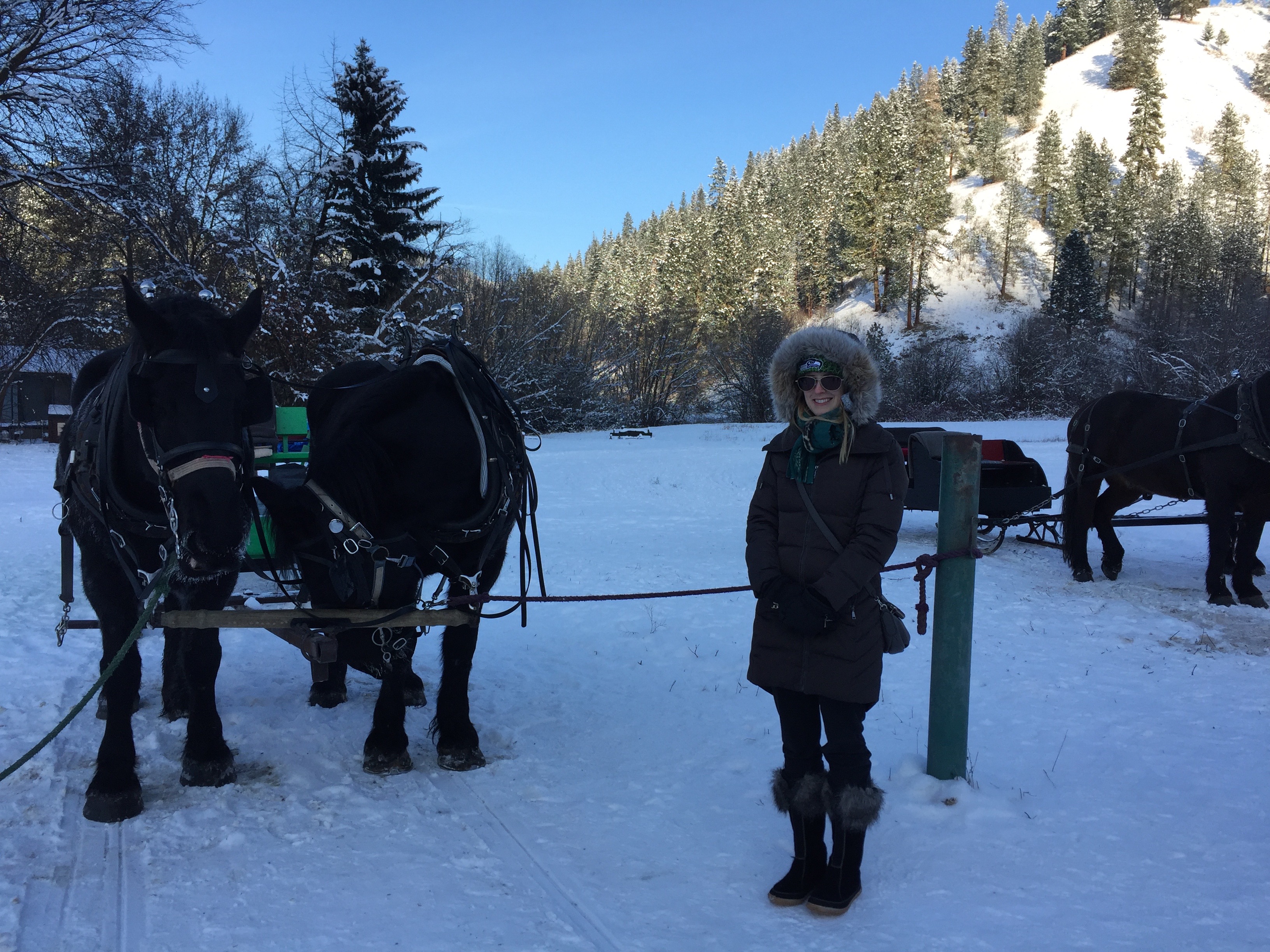 Pictured above is Grace with our horse team Tim and Tom at the Eagle Creek Ranch. It was a beautiful brisk day for a sleigh ride!