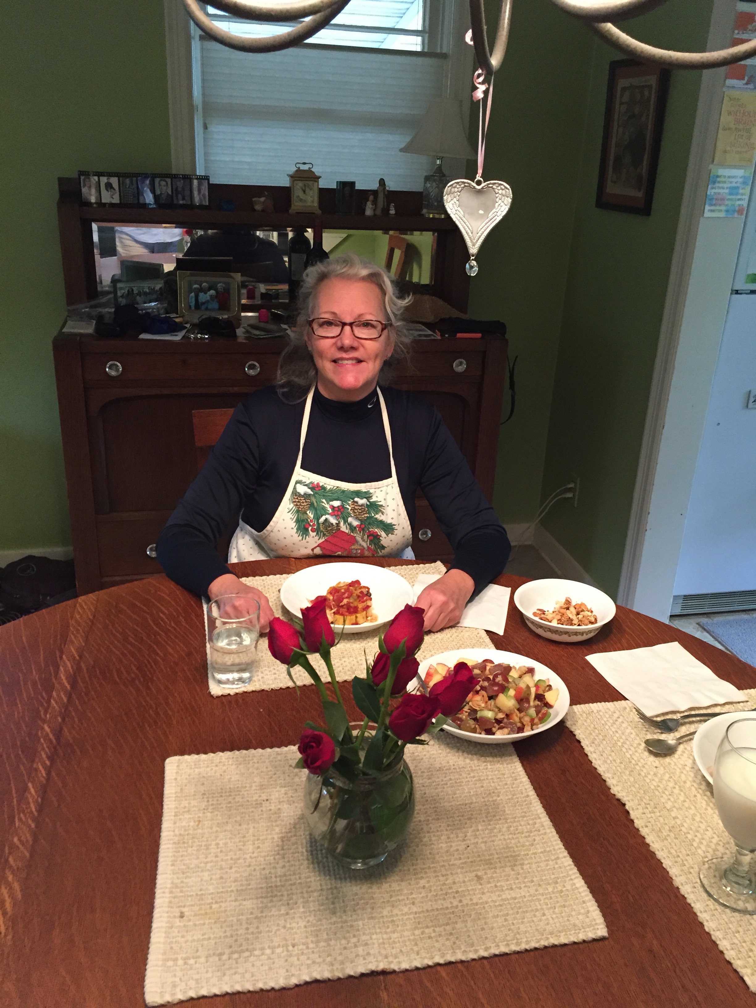 Since my mom passed away, I have stayed with my sister when home for visits. I also love to cook with her in her kitchen and share meals with her on my mom’s dining table. What a special feeling! This last visit we made the classic, tasty salad with apples, celery, grapes, and glazed sliced almonds.