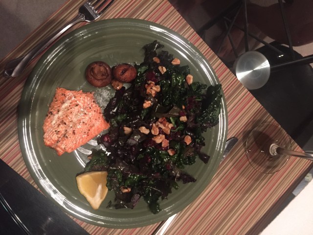 Carrie Dennett also reports that research indicates that what we do is more important than the numbers on the scale, for improving our odds of living longer and better. What you need to do to improve your health odds is less than what you might expect. A kale/chard salad with grilled salmon hit the hunger spot!
