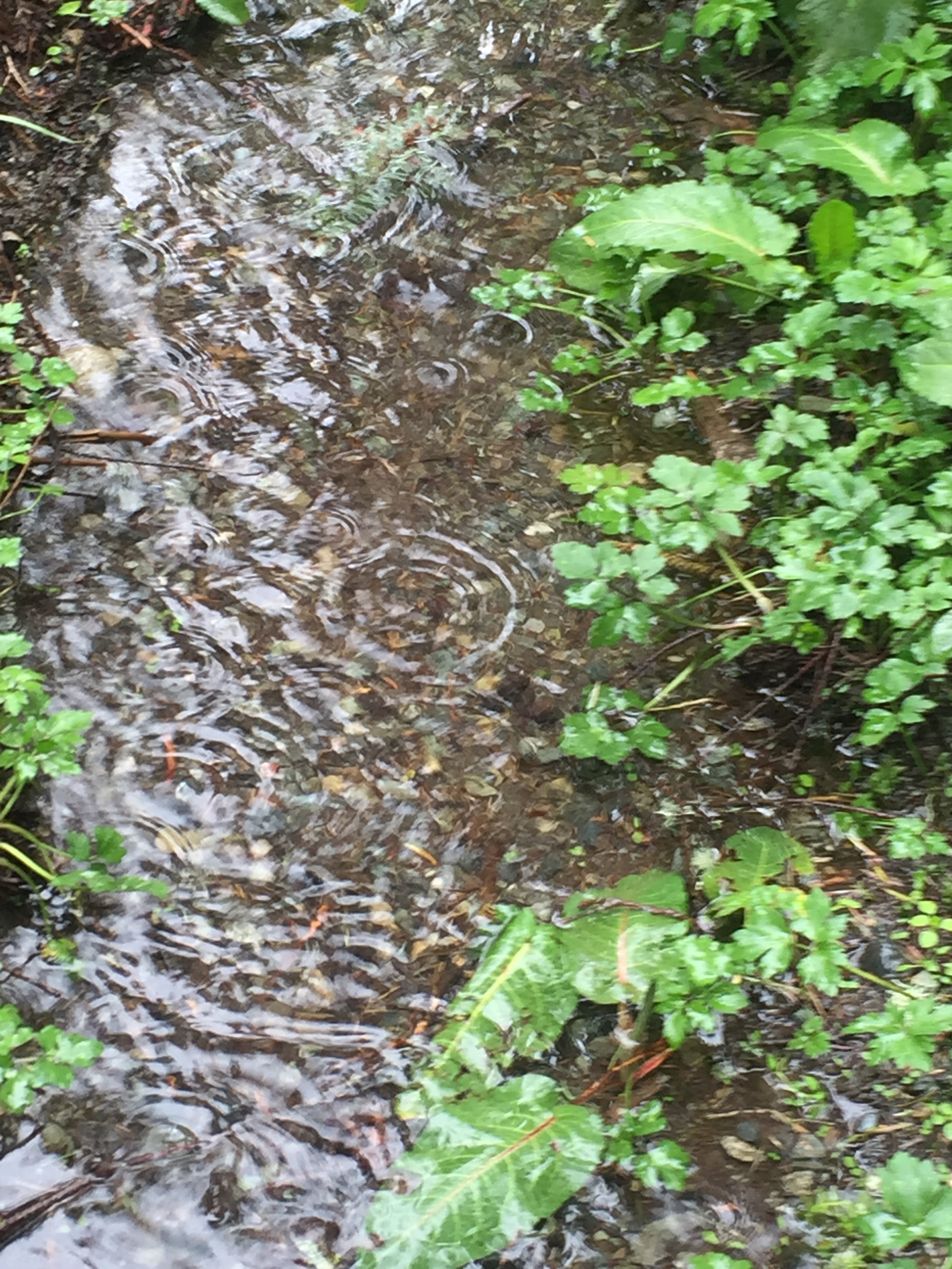 The running water was beautiful with the raindrops creating small and large concentric circles.