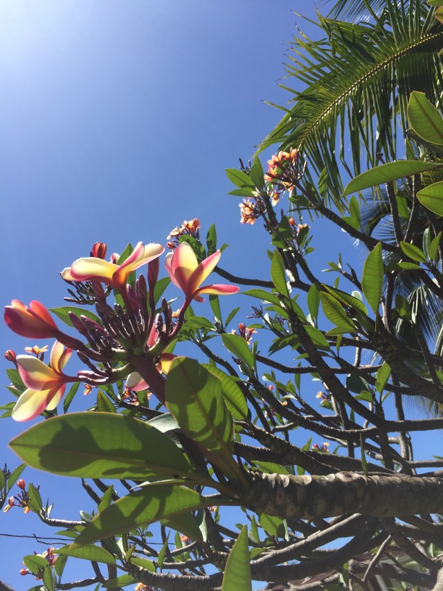 When you step onto any of the Hawaiian Islands you will smell and see the most beautiful tropical flowers. It seems like the iconic Hawaiian flower is the Bird of Paradise, but my favorite by far is the Plumeria. The heavenly scent from the velvety petals of this flower is amazing. I biked past this Plumeria shrub or small tree in the town of Kekaha on the island of Kauai. I just had to turn around and stop to smell the flowers!