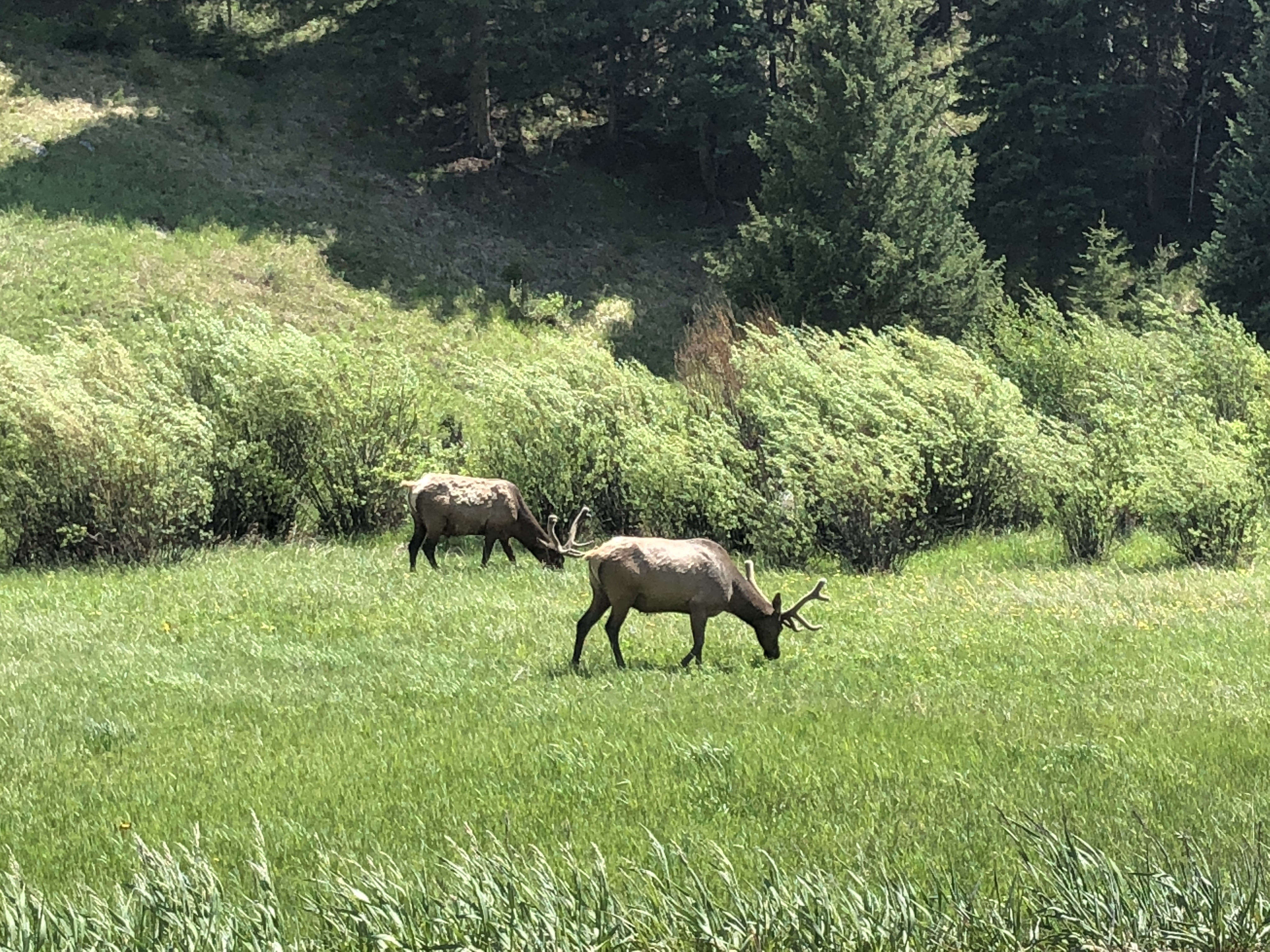 We also stopped to rock a little on the porch of the Roosevelt Lodge. After a lunch of smoked trout and bison tamales (yum!!!), we drove south towards Canyon and made it up to Dunraven Pass. On our way up to the pass, we saw a black bear high up on a ridge above the road. We then drove back up to Roosevelt and headed out on the upper east entrance of the park into the Lamar Valley to check out more animals.
