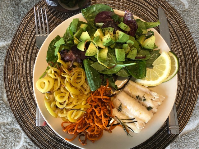The above June meal was spiraled gold and sweet baked potatoes with an avocado green salad and baked halibut.
